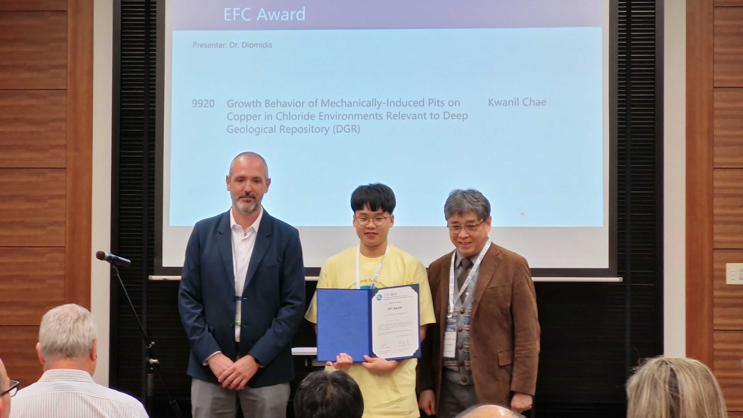 ◦ 최성열 교수 연구실 채관일 대학원생이 ‘9th International Workshop on Long Term Prediction of Corrosion in Nuclear Waste Systems(LTC2025)’에서 European Federation of Corrosion(EFC)이 후원하는 Young Researcher Award를 수상하였다. LTC는 고준위방사성폐기물 처분용기 및 관련 재료의 장기 부식 거동을 다루는 국제 워크숍으로, 방폐물 처분 안전성 향상을 위한 최신 연구성과를 공유하는 전문 학술 장으로 평가받는다.