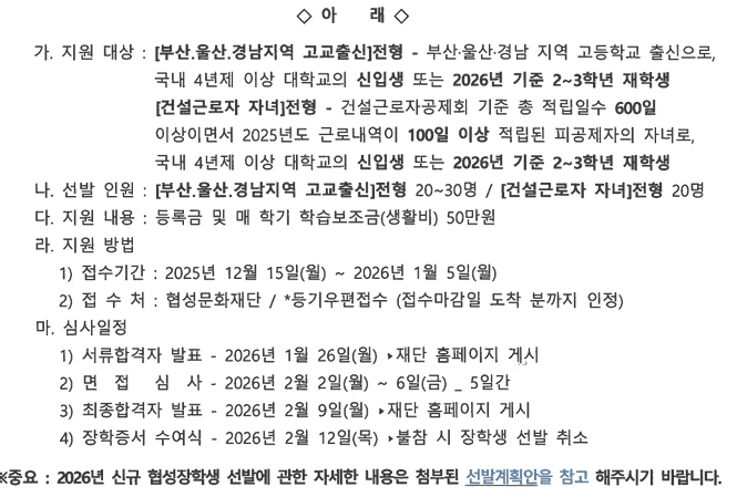 - 2026년 건설근로자 자녀 대학생 신규 협성장학생 선발 계획안.pdf (150 KB, download:14)