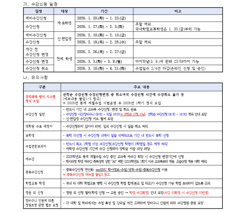 2026학년도 1학기 수강신청 일정을 안내드립니다.