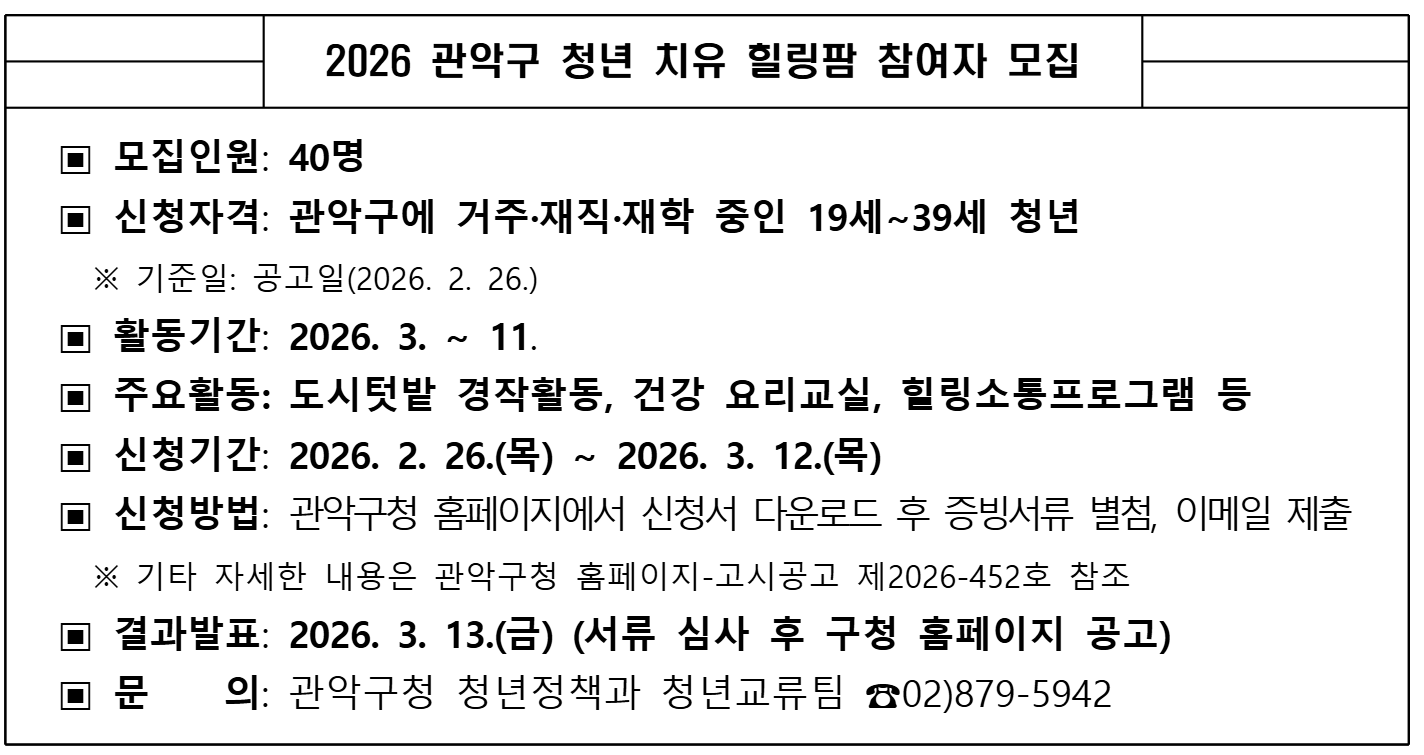 관악구청에서 청년의 건강 증진과 사회적 교류망 확대를 위한 『청년 치유 힐링팜』 참여자를 아래와 같이 모집하오니 관심있는 학생여러분은 참여하시기 바랍니다.