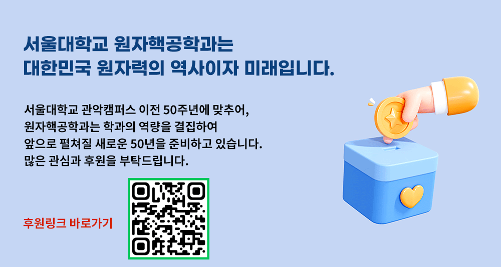 서울대학교 관악캠퍼스 이전 50주년에 맞추어, 원자핵공학과는 학과의 역량을 결집하여 앞으로 펼쳐질 새로운 50년을 준비하고 있습니다. 대한민국 미래 원자력 분야 인재들의 산실이자, 미래 원자력 기술의 중심지가 될 학과 건물 재건축 및 통합 연구동 건립을 준비하고 있으며, 원자력 기술의 미래 비젼을 제시할 다양한 활동 및 사업들을 기획하고 있습니다. 이에 필요한 경비를 마련하고자 서울대학교 원자핵공학과 미래 발전 기금을 모금하고 있습니다.